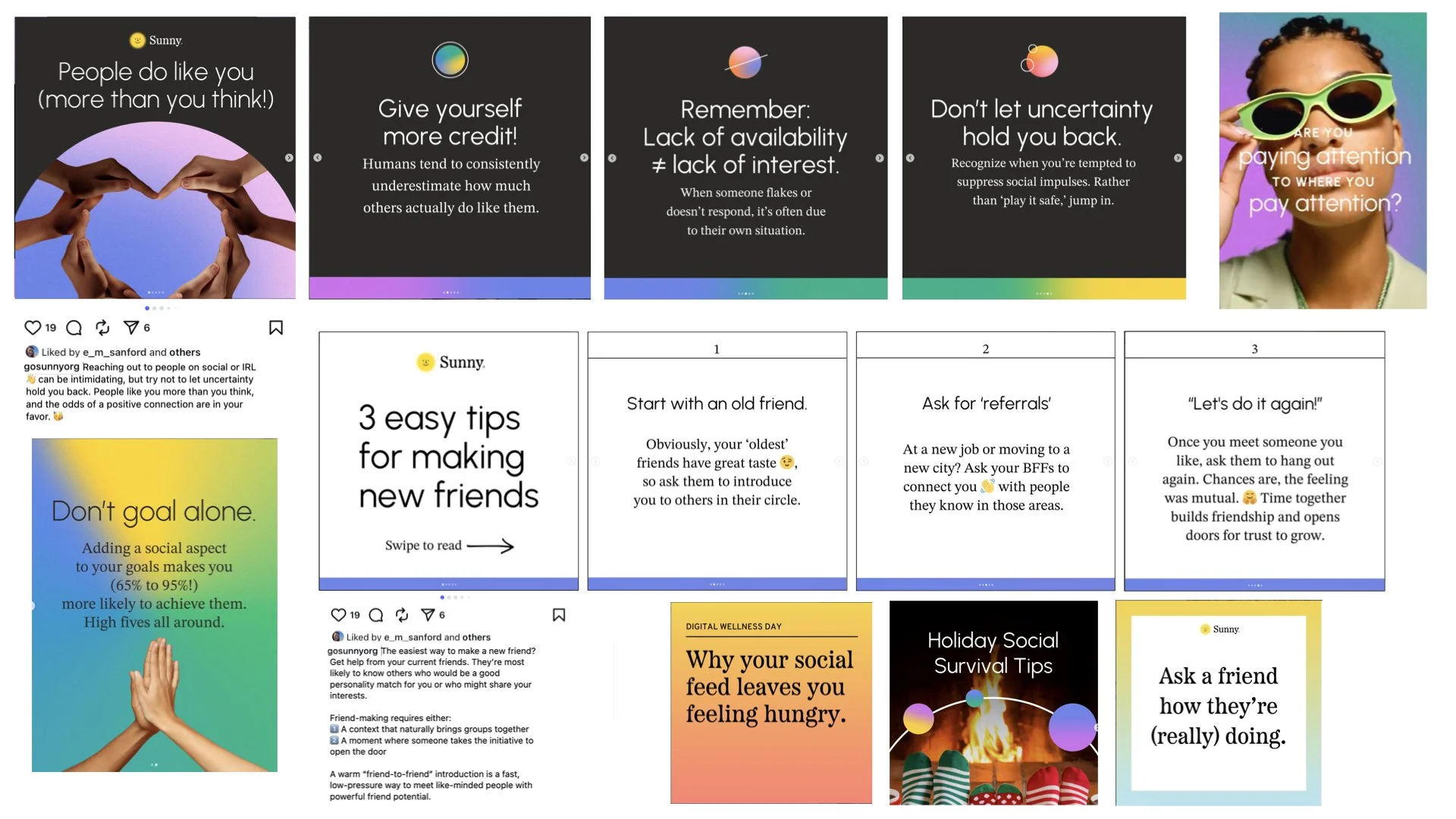 The employees at Sunny aren’t just purveyors of social well-being. They’re active participants. We helped craft an internal playbook and external platform worthy of this calling.