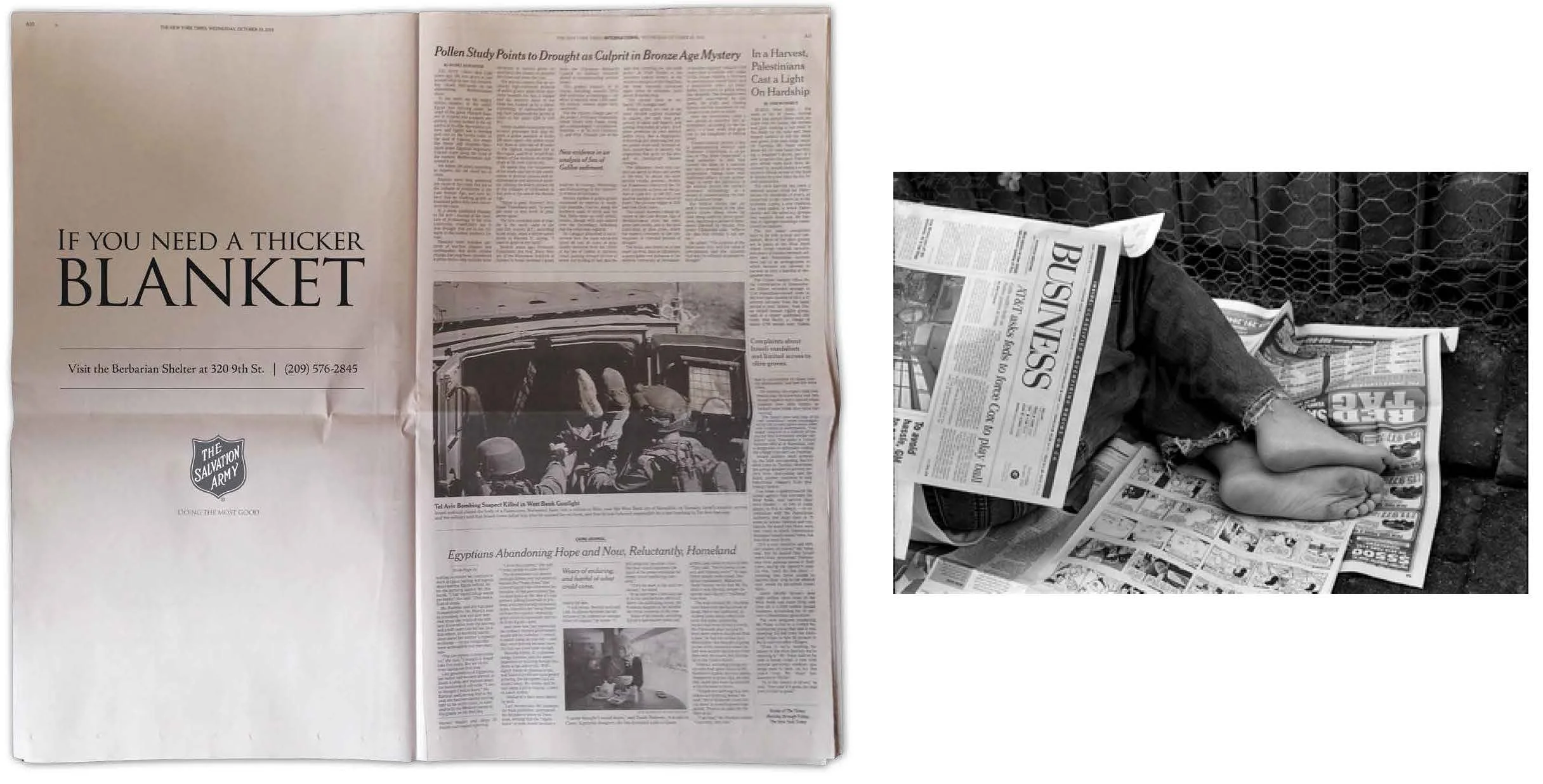 Newspaper Ad In the winter months, newspapers double as blankets and insulation for those living on the street.